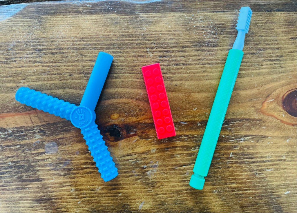 Do you constantly find your child chewing? Trying to eat non food items? Or placing everything in their mouth? For quiet some time, it was almost as if my youngest never exited the “oral stage” from when he was an infant. We still have to watch small toys around him. If this sounds like your child, this toy may be for you. The two toys on the left are merely for chewing. I used these for Maxwell when he was CONSTANTLY putting things into his mouth. I would take whatever object he was trying to chew on and replace it with this chewy. It was my way of saying “I understand you have a sensory need that needs to be met, but this is not an appropriate object to do that with. Here is something that allows you to meet that need and will not harm you.”