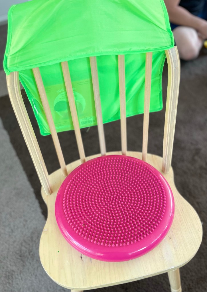 Maxwell used to have a VERY hard time sitting at the table to do any kind of table time work. Until about 6 months ago, we had a booster seat (he’s 3) that we would have to strap him in, in order to do any table time activities. Both this “wiggle seat” and weighted vest has allowed us to remove the booster seat temporarily! This literally just looks like a cushion with bumps on it to allow for a sensory need and movement while seated at the table.