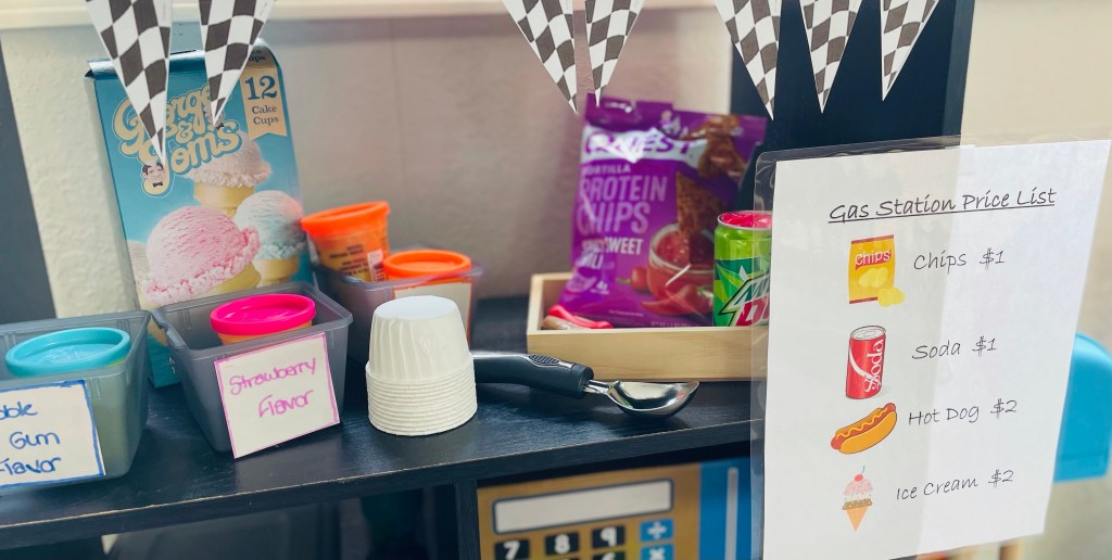 Last but not least this week is pretend play! We are working with money again. So I figured why not introduce the boys to our number one stop on a road trip… the gas station! The boys can go shopping at the gas station for chips, soda, hot dogs or ice cream! I am a big believer in saving money. So instead of buying new toys for this I shoved a plastic Wal-Mart bag in an old bag of chips and stapled it close. I also saved an old Mountain Dew can. I did put duct tape over the opening of the can so the boys wouldn’t cut their fingers. So far so good.