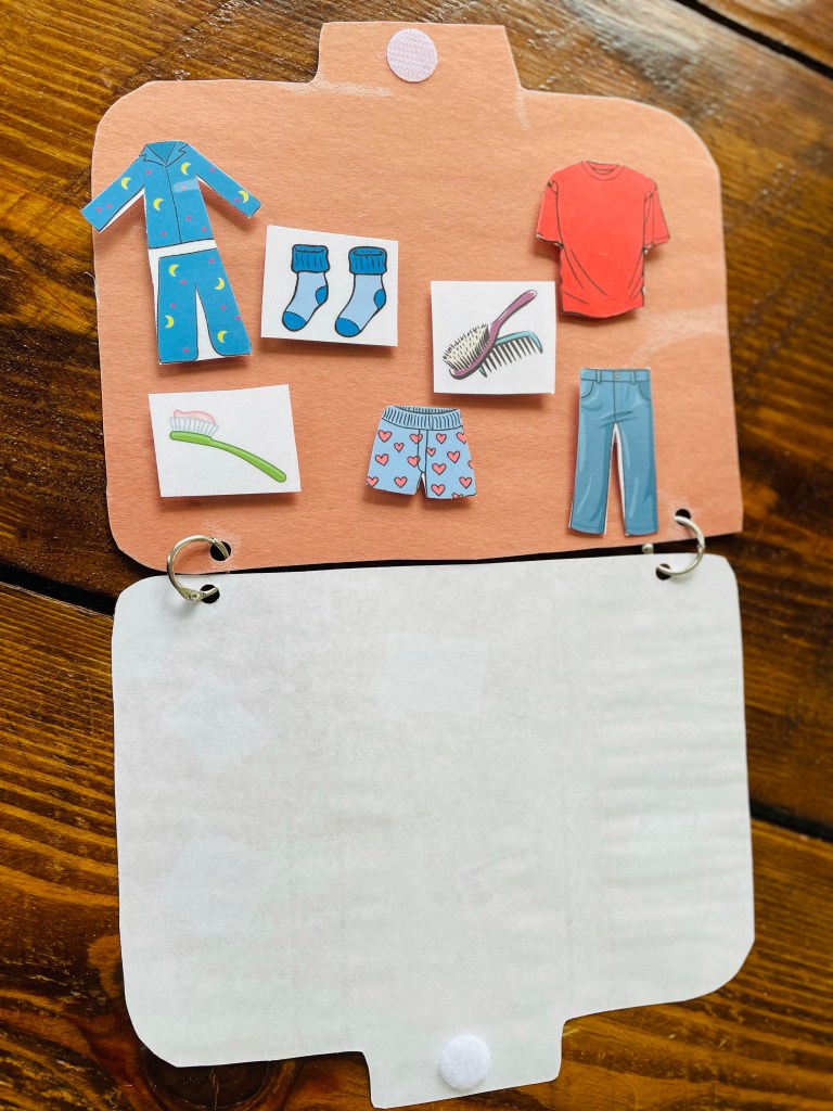 Luggage- I am trying to increase the boys independence anyway I can. For Vincent, that means picking out his clothes! With this activity he can learn “before we go on our trip we need to pack our bag” it will also help him understand that we get to make choices. “I put this in the bag, so now I get to wear it.” It also just simply helps with following directions. “Let’s put the shirt into the suitcase.”