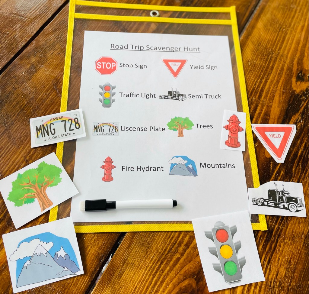 Scavenger Hunt- this goes along the same lines as that above. Before I can expect Maxwell and Vincent to just know how to play. I have to introduce it and because they don’t understand communication like your typical three and five year old,,this means I have to physically introduce the activity. To practice for our road trip scavenger hunt I made one for home! The cut out pieces are meant to be taped around the room/rooms depending on how difficult you would like to make the activity. And then the boys are supposed to find the object and cross it off their list! My hope is when we go on our road trip they can perform something like the one listed below!