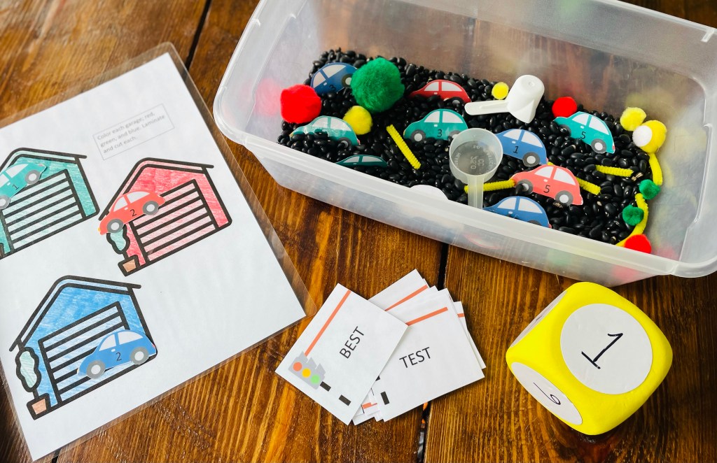 Maxwell can also work on color recognition, following directions and sorting with the small cars! Each small car has a corresponding colored garage. Each green car goes into the green garage. Each red car goes into the red garage and so on. The print out that I have attached has five of each color. However, 15 cars is too much of a task for Maxwell to sit through, so always, always adjust anything to your child’s needs.