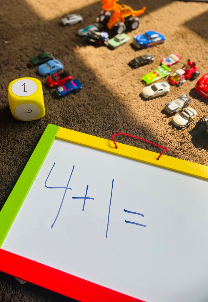 Another way Vincent has played with them is with the yellow die (his favorite toy this week.) We roll the die and yell out the number. We then can either find the “5 car” if we roll a 5 OR find 5 of the cars from the bin and practice counting. We then write this number on our white board, yell out “PLUS” and roll the die again and repeat the process from above. Like pictured below.