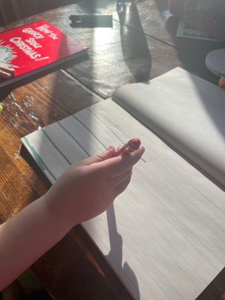 Christmas craft! Vincent is very literal so he has to be told what to do. Here he is drawing a square… following directions for the win though!