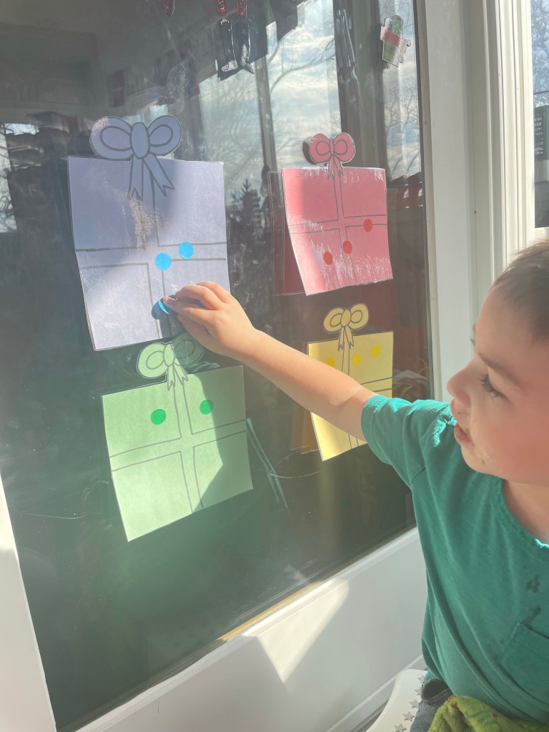 Color sorting with stickers and Christmas presents! Works on color recognition AND sensory needs!