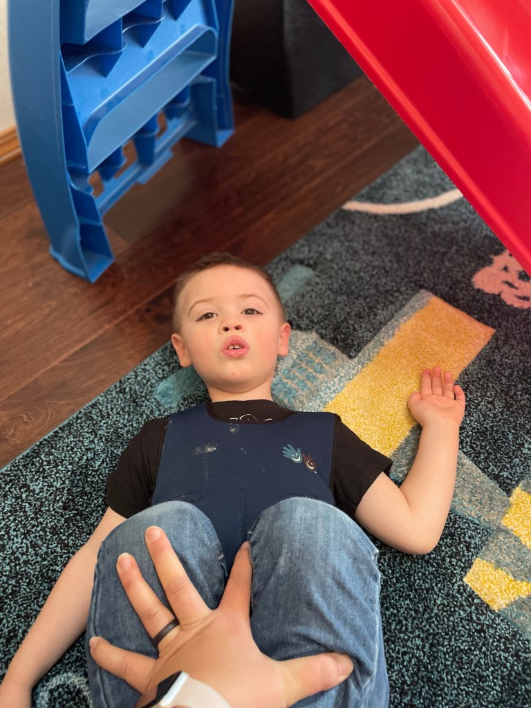 Morning squeezes! Compression on all of Max’s joints helps to calm him down before any table/rug time activities.