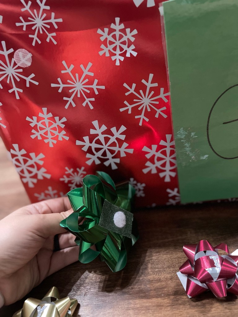 Pick a letter card. In the example we chose the “j.” Make sure to lay out all of the bows in front of your child and have them choose the uppercase version of the letter shown.