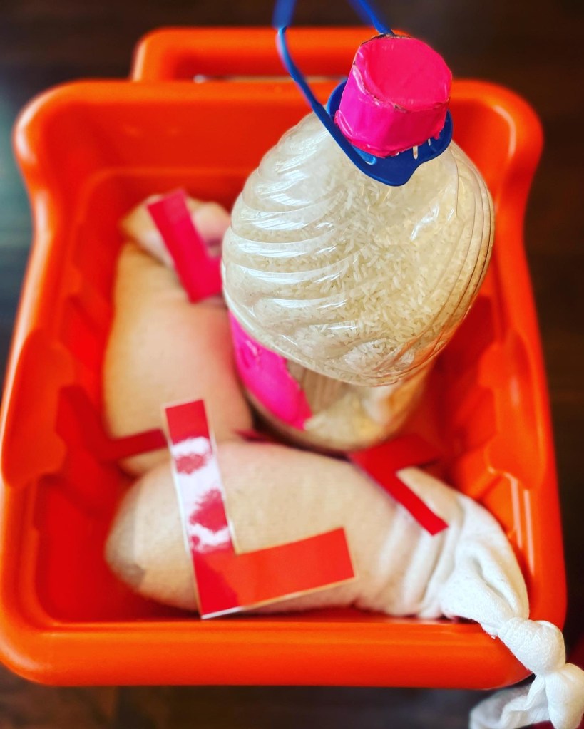 For example, the socks in the above picture are full of rice as well as the jug. We often have him jump from our mats with one of these in hand and place it in the dump truck. After carrying the heavy load we have him push the heavy load.