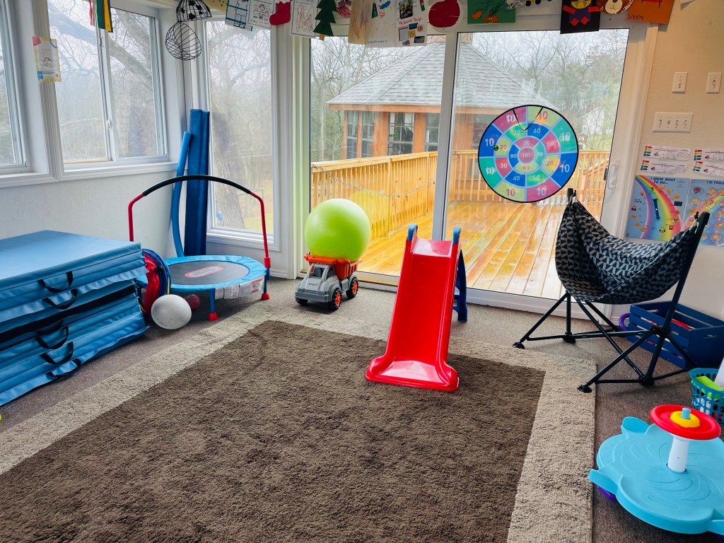 This is our gross motor area! The “mats” are over to the left and what we do most of our heavy work off of. We got these off of Amazon and I put a link to the ones we purchased. I bought these 2 years ago and after much wear and tare they are still in great shape! We bought 3!