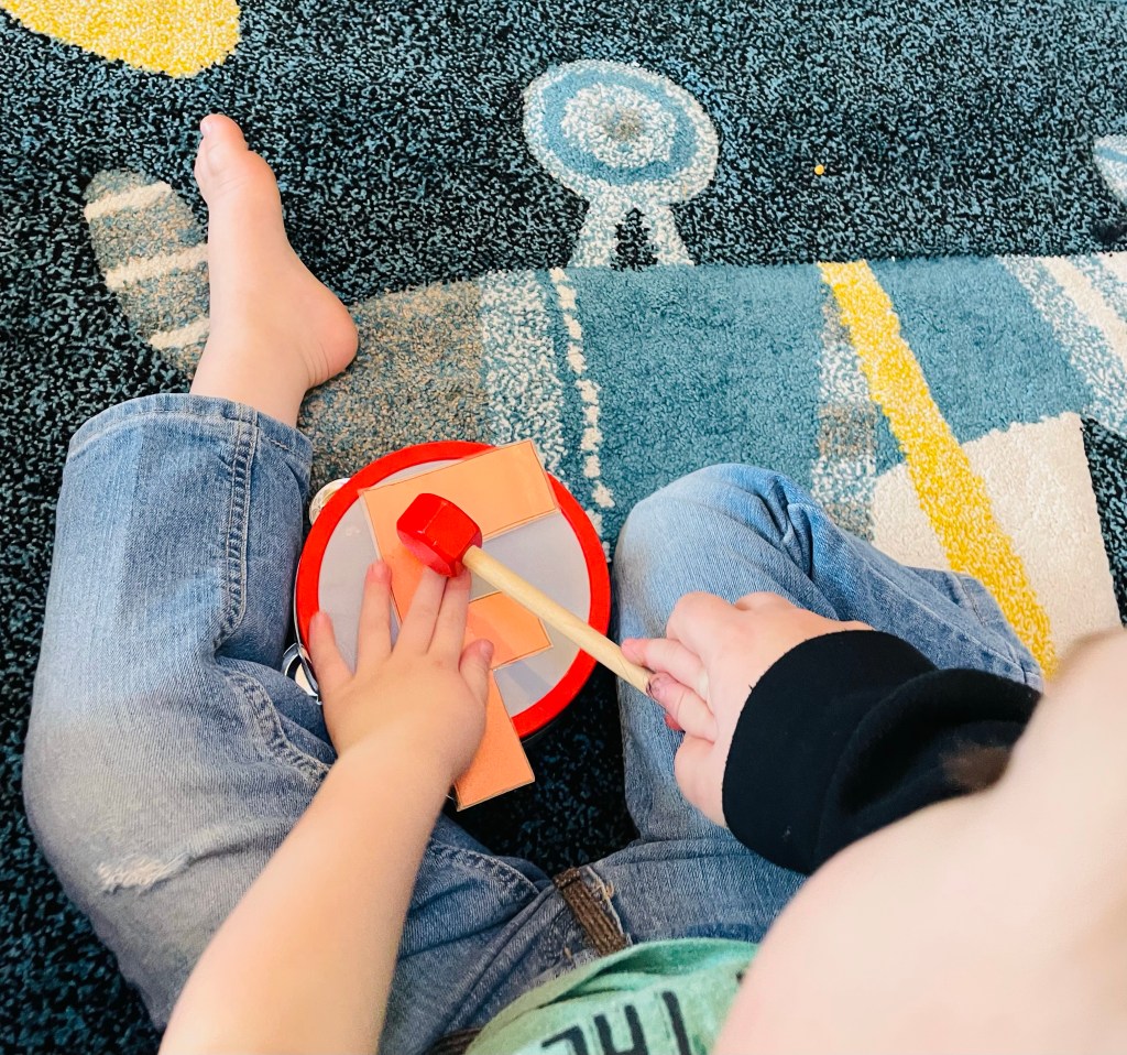 We have recently begun incorporating music into Maxwell’s schooling. This allows him to move and hear his academics in a new way. This week we learned about the letter F. I was surprised at how much he enjoyed hitting the “F” on the drum while listening to “the F song”.