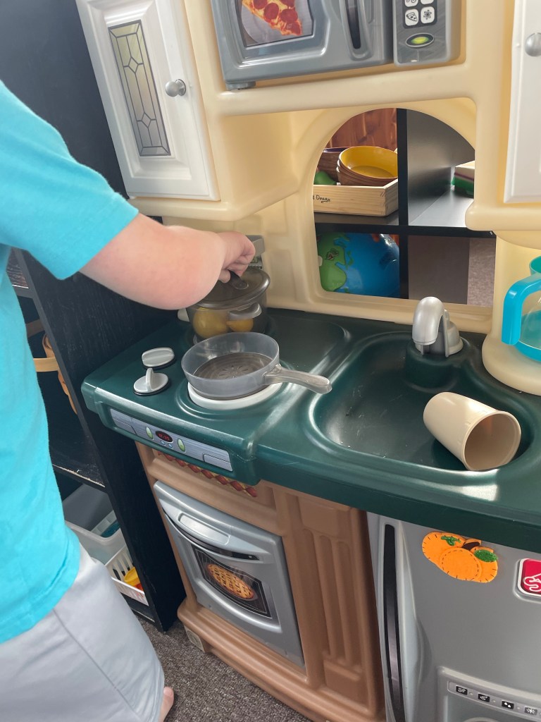 We also include pretend play during the social skills time. Most of our pretend play is adult lead at this time. So, I typically, make statements like, “I would really like some pizza today. Would that be $2?” Vincent typically is able to follow along with this type of play. Find what works for your kiddo, getting down and playing WITH THEM is the best way to find this out.