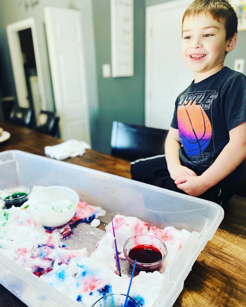 Here, Vincent is painting in the snow. This is a great low prep activity on a snow day. We gathered snow, water, food coloring and paint brushes.