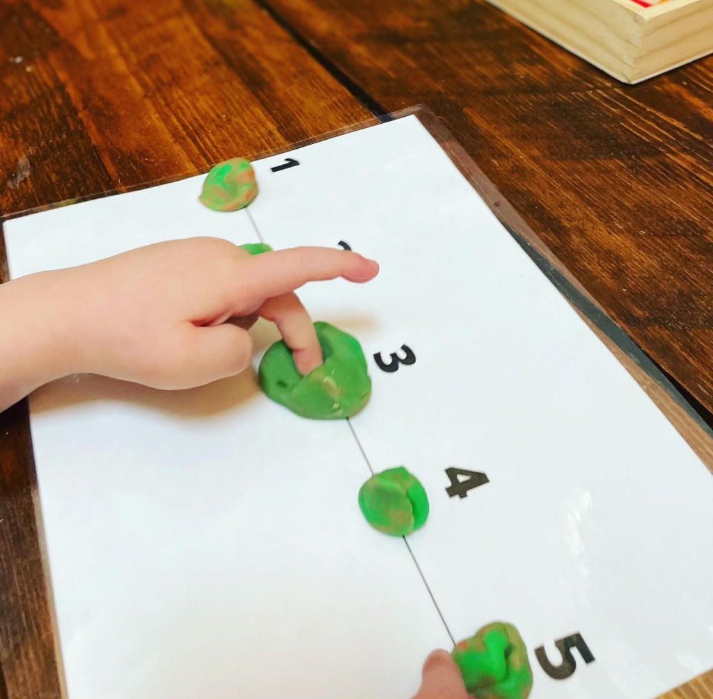 Playdough Number Line- We use this for both a sensory tool and number recognition. We line little balls of playdough up on the number line (1-5 for my little) and then count “1, 2, 3, 4, 5” by pushing down on each ball of playdough. If your little is more advanced you could have them identify the number by pressing down on the playdough or pick up the “ball 3” and put it back in the container for a clean up activity (my favorite activities!)