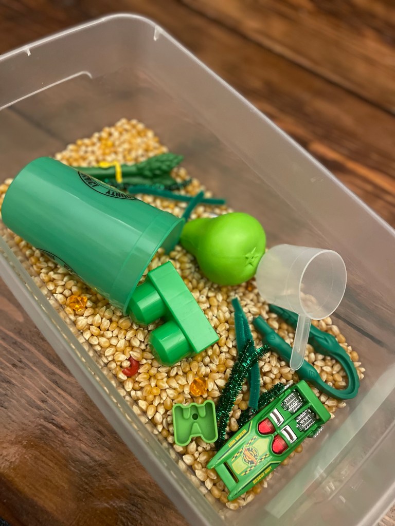 Green Lacing– Because the color of the week is green, we grabbed our lacing beads from our STEM center and practiced just lacing the green ones. Each time Maxwell placed a bead on the string I would state, “green” to help reinforce his colors.