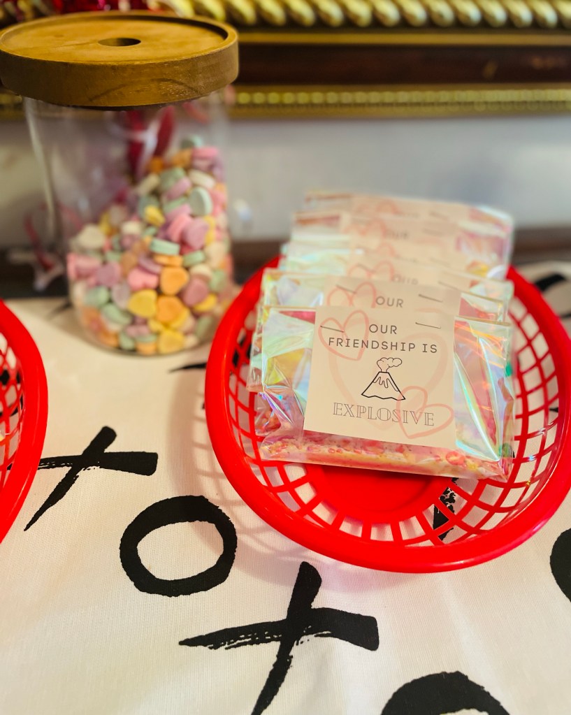 For valentines, we handed out the bag above. The handout is available for less than for $1 through this download. We put this download on front of party bags and filled the bags with baking soda and sprinkles so that the children can have an easy go to science experiment when they get home!