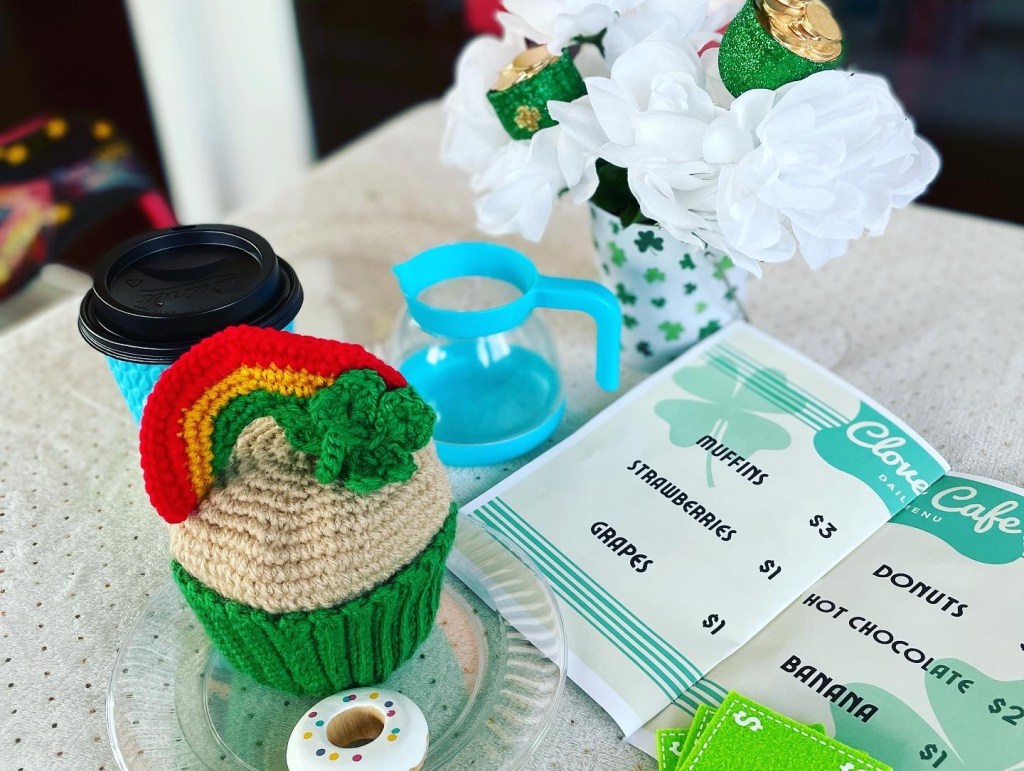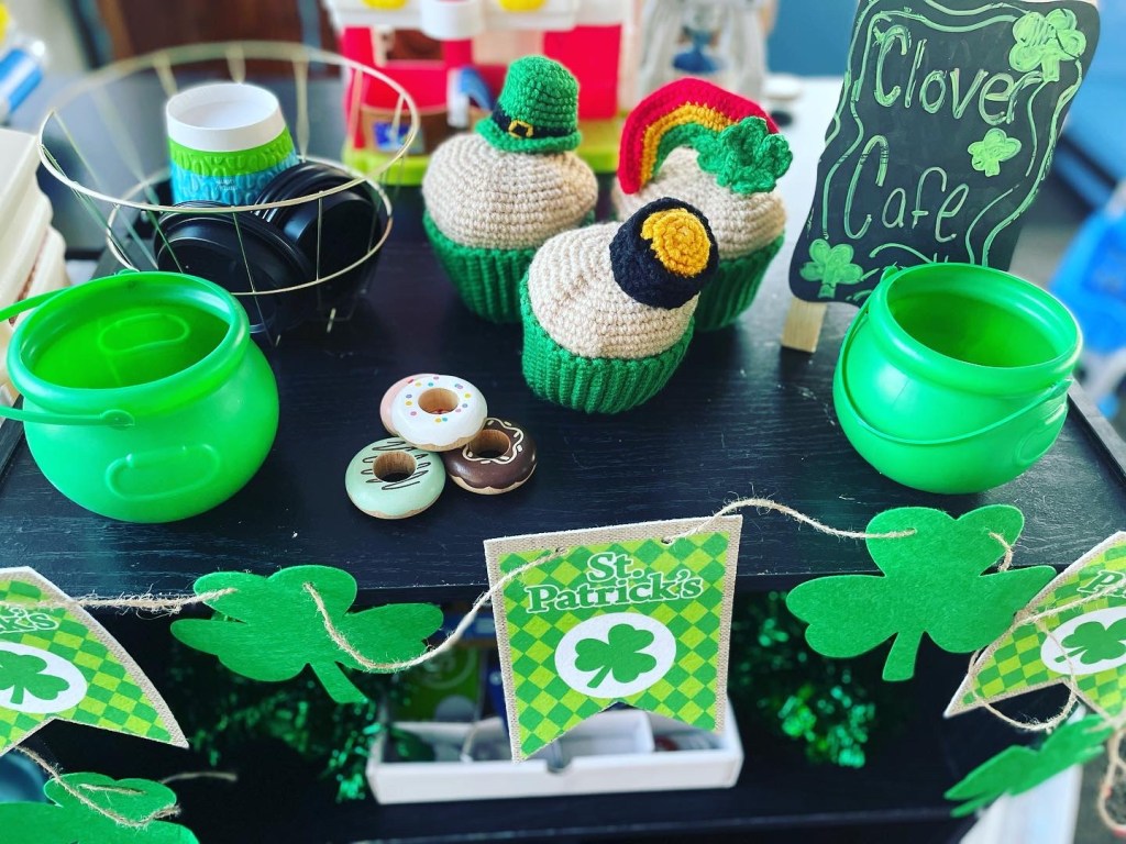 Each month we try to change up our pretend play area so that the boys an experience several different “experiences.” This week we changed our “Valentine Shop” into our “Clover Café.” Our Clover Café has all the things you would find at a typical café. Hot chocolate, muffins, donuts and fruit!