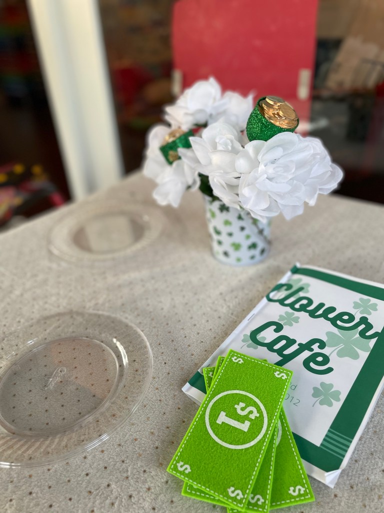 Let them have a seat at the clover café, place their order and then pay! This has been a great way to continue to work on math. We tried to keep all of the items low priced so that Vincent (5) is able to add up the money that he needs to purchase.
