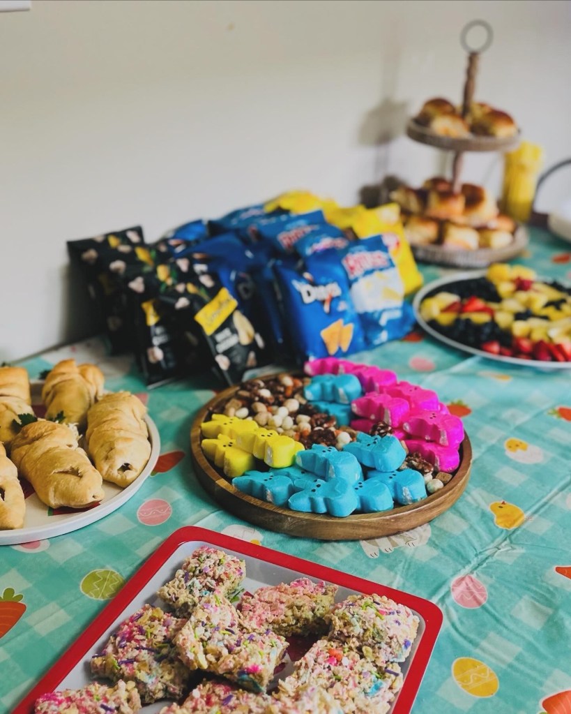Pillsbury Carrot filled with chicken salad, Peep Rice Krispy Treats, Easter themed charcuterie dessert board, chips, fruit tray shaped like a bunny and sliders.